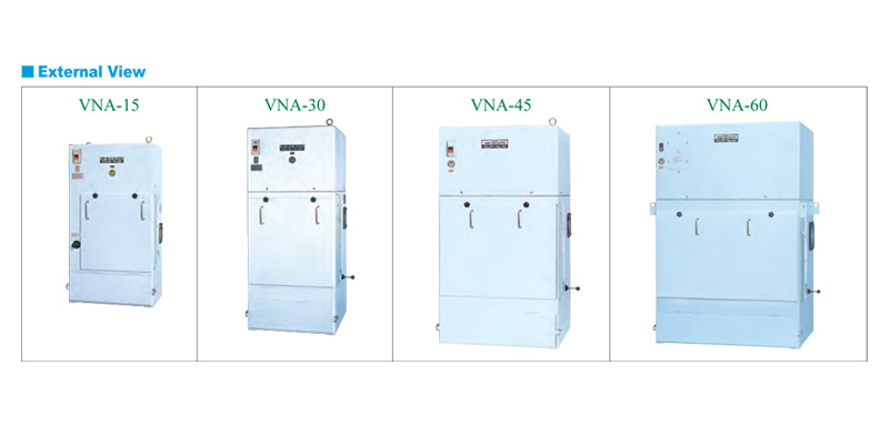 Standard type dust collector. VNA series employ plate filters, giving them a wide filter area, while enabling them to collect even micron-sized particles with tremendous efficiency. Filter are cleaned by manual shake or automatically shake.