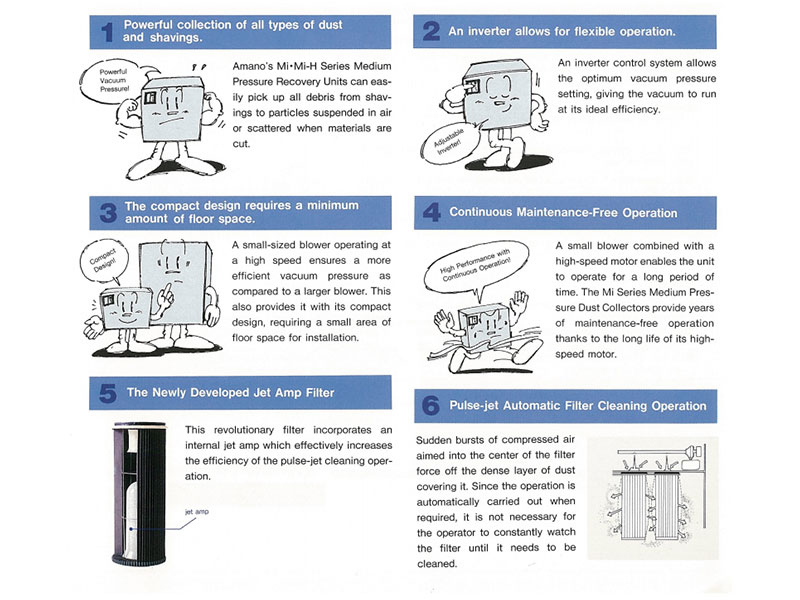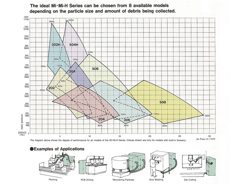 The Mi • Mi-H Series are a medium vacuum pressure, medium air flow recovery unit. The Mi • Mi-H Series is ideal for vacuuming scattered or floating particles and shavings.